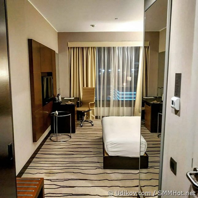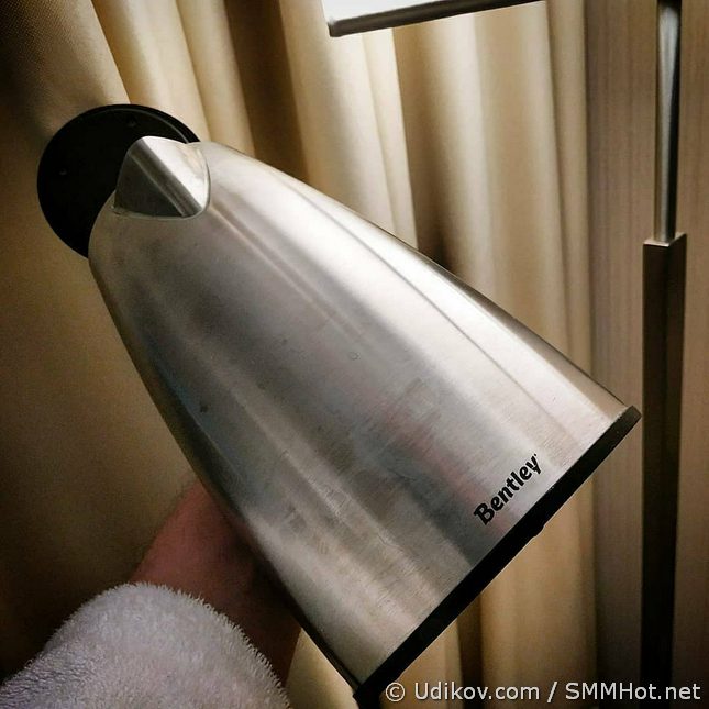 Je ne peux pas ne pas mentionner la bonne insonorisation. Près de l’aéroport c’est très important ! D’ailleurs, pour une localisation aussi commode, c’était étonnamment peu fréquenté. Et puis, pour une nuit j’ai été le propriétaire d’une toute nouvelle « Bentley ». Hélas, pour l’instant ce n’est qu’une bouilloire. Le soir nous sommes montés dans le bar panoramique. Là, c’est encore plus haut et plus beau, mais la vue sur l’aéroport depuis le bar différée peu de la vue depuis notre chambre.